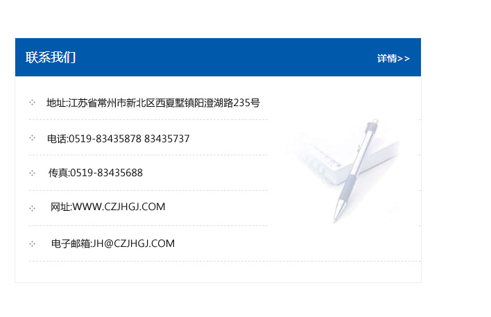 傳真:0519-83435688    郵編:213135    網址:WWW.czjhgj_com.qdrkwl.com    電子郵箱:JH@czjhgj_com.qdrkwl.com